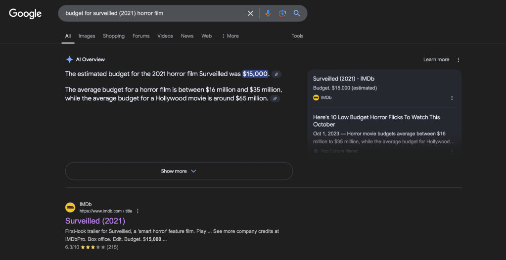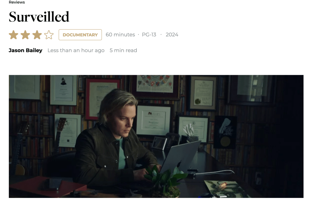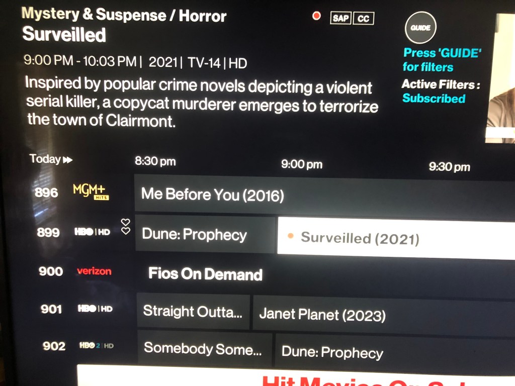 Yet despite Verizon Cable’s best attempts to foil my viewing experience of “surveilled (2024)” with its own subtle disinformation tactics. I will be tuning in regardless of what their (mis)guide tells me. Which, is apparently that @ 9 pm a low-budget horror flick of the same title will be airing this evening on HBO. I can promise you that if I had been aimlessly channel surfing, as I often do, I would have intentionally avoided this listing like it was the new Covid variant and missed out on something I am genuinely interested in watching.