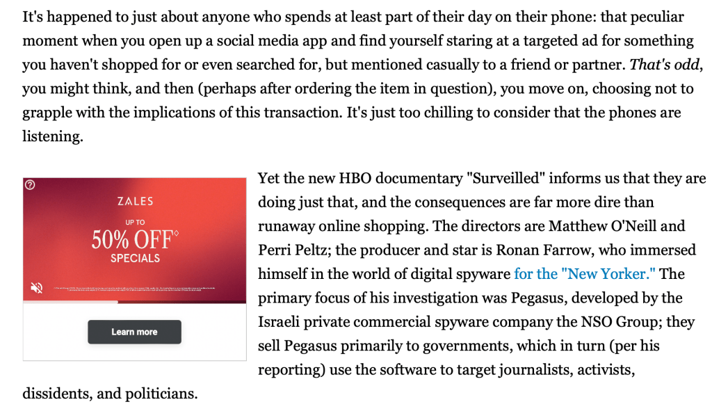 Airing tonight on HBO @ 9 PM EST (also Streaming on MAX) is the premier of “Surveilled” a Ronan Farrow documentary about the multi-billion dollar spyware industry and its usage in the hands of governments, including right here at home in the good ole U-S-of-A. A certified must-watch for those of us who willingly put our deepest darkest personal info into the hands of our cellular co-pilot and daily companion.