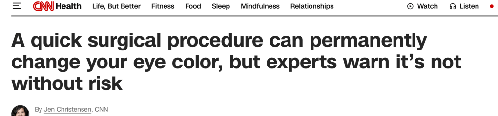 For the full CNN article quoted in this column click the link https://www.cnn.com/2024/08/22/health/permanent-eye-color-change-surgery/index.html#:~:text=A%20person’s%20eye%20color%20comes,original%20color%20of%20the%20iris.