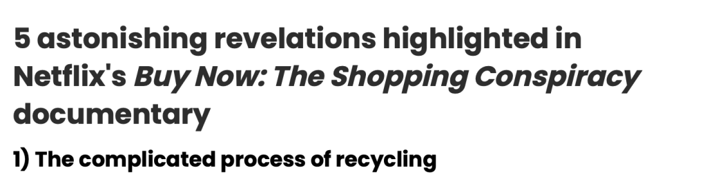 Although Sanchari Ghosh made a captivating top 5 list of the revelations in “Buy Now!….blah, blah, blah”. I must say, the thing I found most astonishing (besides the obvious climate consequences) was the amount of brand-new unused swag corporations are throwing in their dumpsters. Enough to create an entire online industry of dumpster divers. But to avoid people profiting off their trash or the homeless rocking their name-brands. These companies intentionally destroy perfectly unconsumed items, just so they can make shelf space for their latest upgrades. The never-ending corporate greed is nauseating.