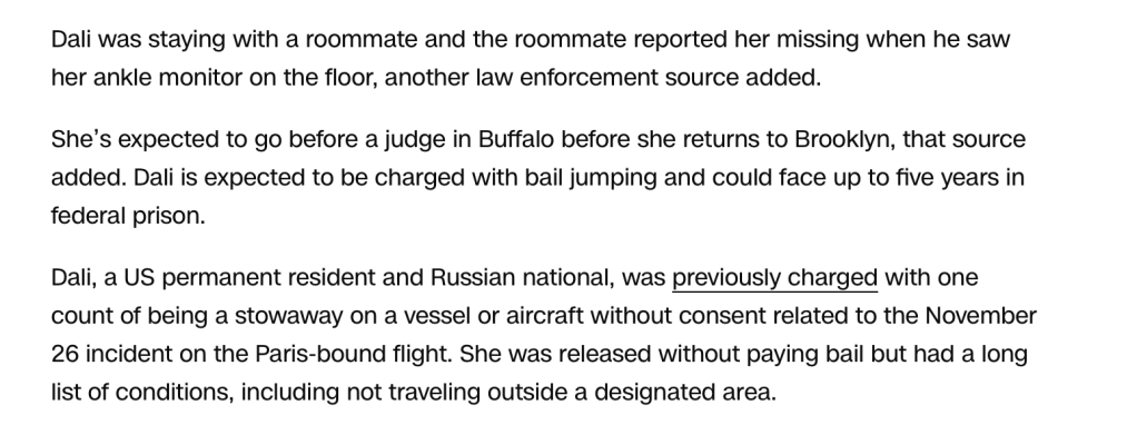 Dali thwarted the US government’s advanced tracking device strapped around her ankle by simply removing it. However, her church companion/roommate proved too shrewd to effortlessly dupe. Perhaps disobeying the court’s authority and leaving the evidence on the carpet for all to see wasn’t the best plan. Especially not in the same exact place, a pissed-off dog willingly leaves a newly chewed-up slipper when looking to send a message to their often absent owner. That lack of attention to detail doesn’t induce criminal mastermind vibes, now does it. Nonetheless, not since Salvatore followed up his famous painting “The Great Masturbator” with “The Persistence of Memory” has a Dali family member taken such risky back-to-back swings at their given artistry. Not even two weeks after her last capture, Svetlana made worldwide headlines again. Last time, she was caught playing the stowaway version of musical chairs between her unassigned Delta commode accommodations. In an attempt to trick the plane’s crew into believing, “There’s nothing to see here.”