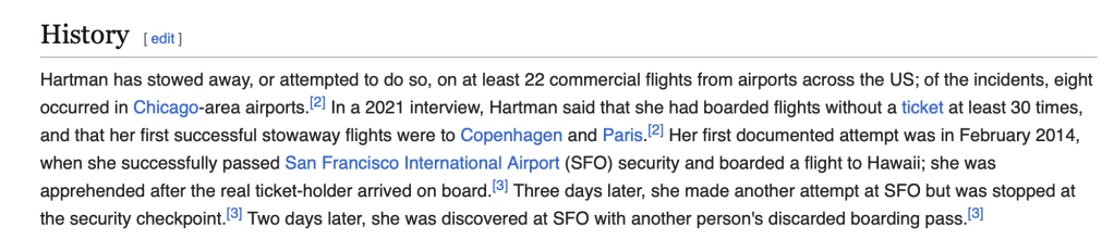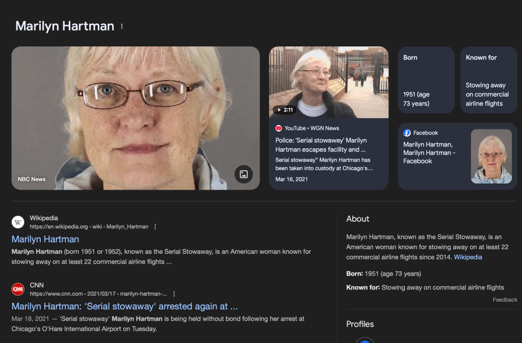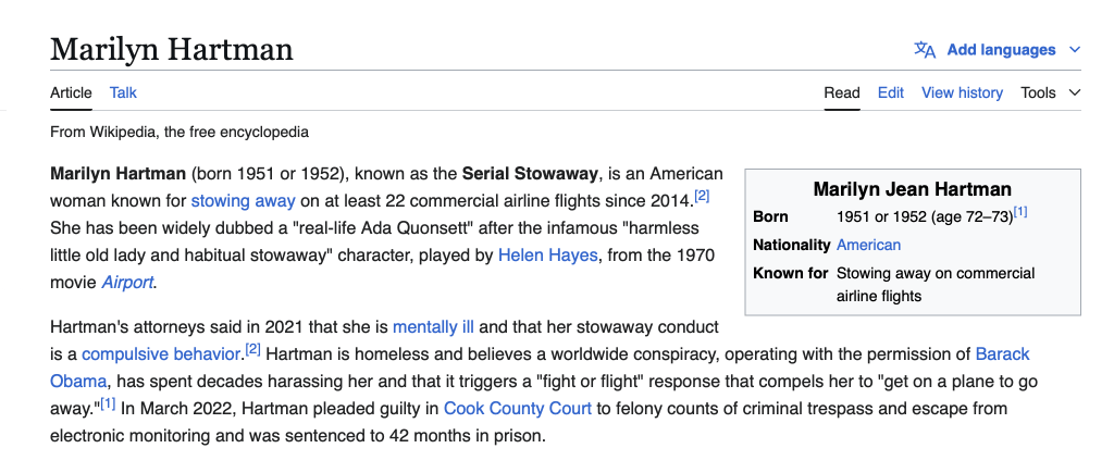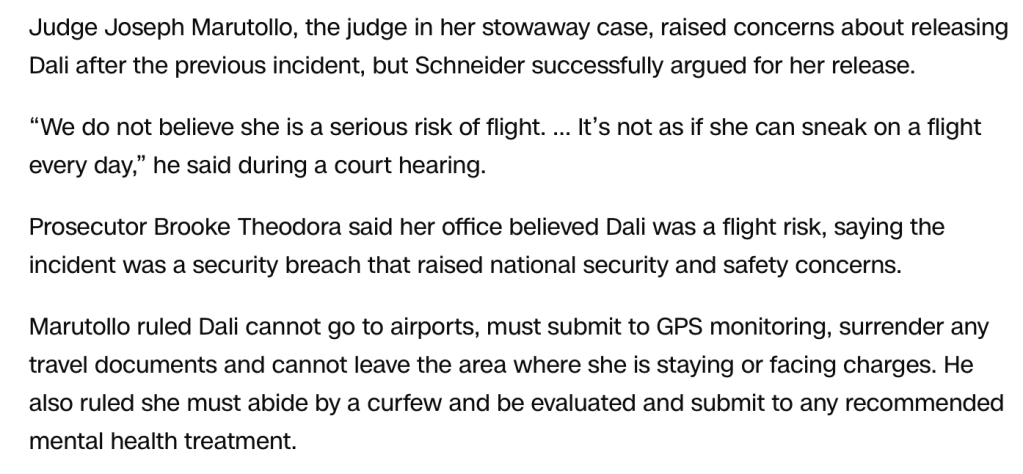 Sadly, it appears Svetlana didn’t have the same positive outlets for her mental struggles as her famous surrealist name-sake found in his artwork, and she still chose to play through without a full deck in hand. So, although the Judge’s valid concerns that she was a flight risk were dismissed, let’s hope his assessment of her psychological condition is taken seriously this time around. Her accusations of being the victim of military-grade chemical weapons and a kidnapping plot may be par for the course in her homeland, Russia. But throwing allegations like that around in the States will get you 5150’d real quick. The more I delve into the conspiratory makeup of Svetlana Dali, her story reminds me of a different woman the press labeled “The Serial Stowaway” a few years back.