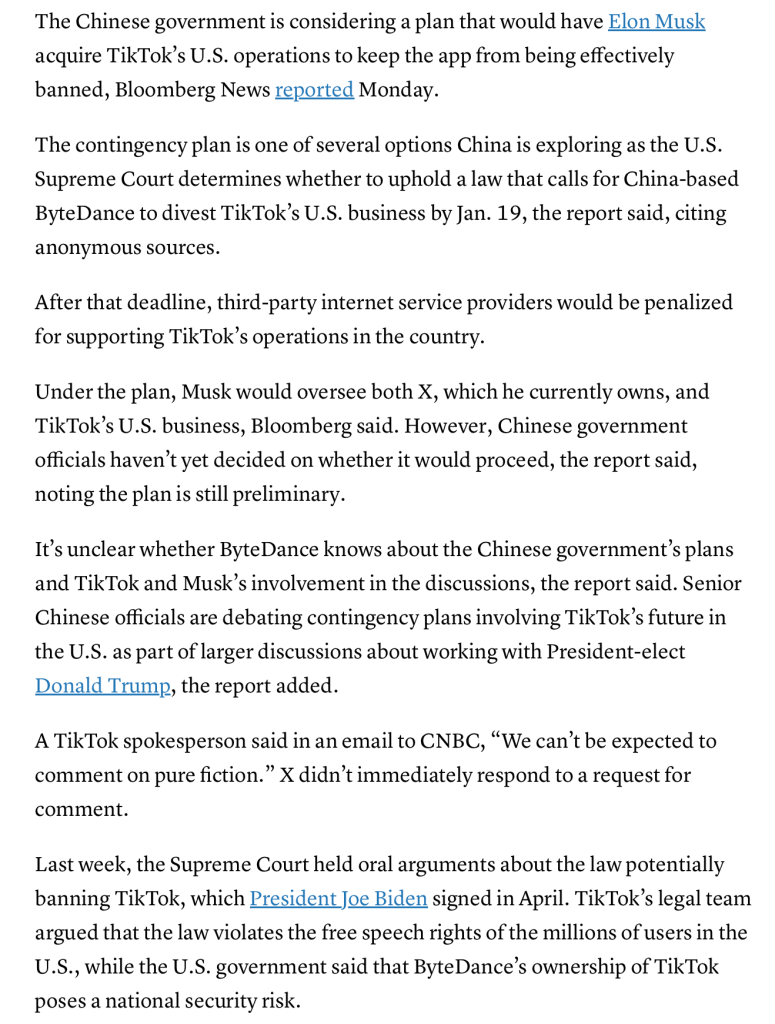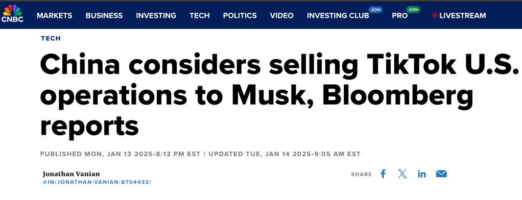 Click the link below for the CNBC article quoted in this column: https://www.cnbc.com/2025/01/13/china-considers-selling-tiktok-us-operations-to-musk-bloomberg-.html