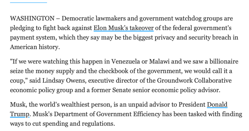 FULL USA TODAY ARTICLE https://www.usatoday.com/story/news/politics/2025/02/03/dems-elon-musk-doge-takeover-treasury/78187978007/