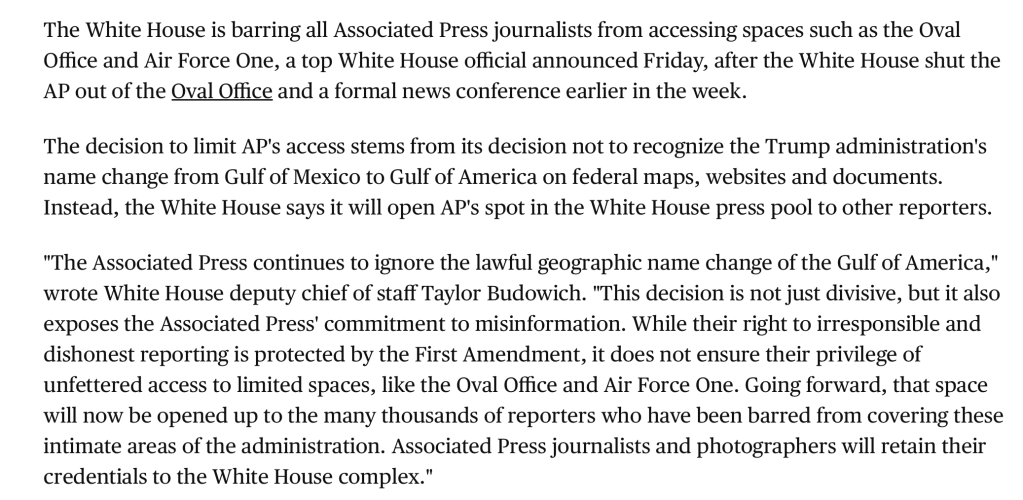 I mean, Donald Trump kicking the Associated Press out of access to his propaganda party over refusing to believe in the illegitimate renaming of the Gulf of Mexico is like throwing your underlying out of a work Christmas party for not believing in Santa Claus.