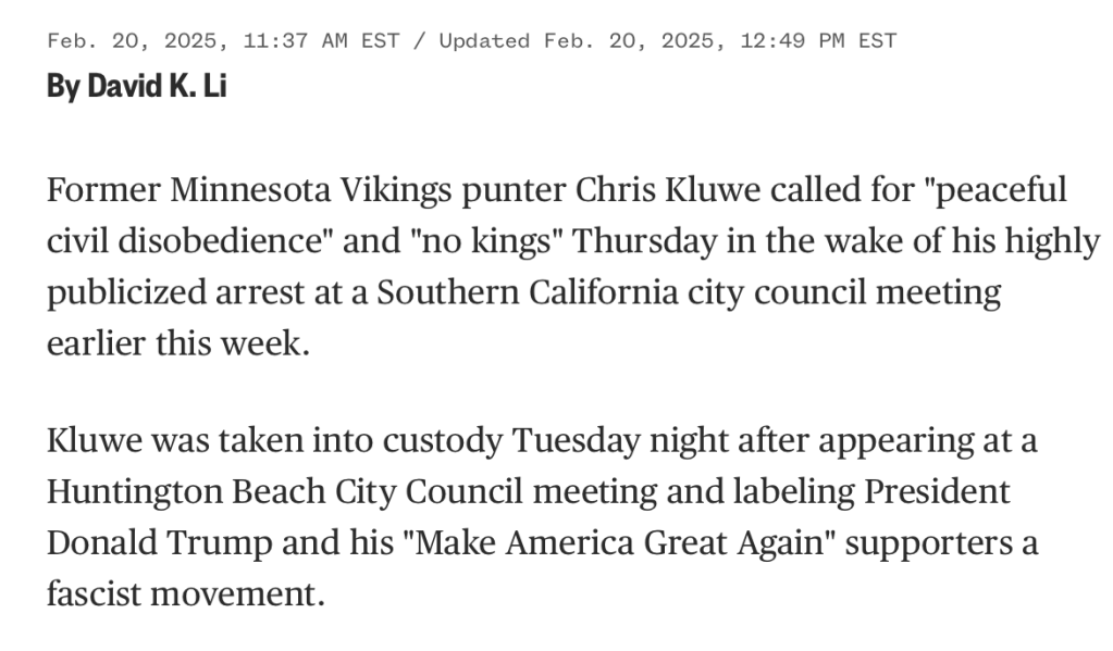 At least one former NFL Player is using his platform to speak out against the Trump regime’s fascist government takeover. Sure, it was only an ex-Minnesota punter speaking to nearly a dozen adoring fans at the Huntington Beach City Council meeting, but don’t underestimate the power of fame and its influence over the masses in this day and age. Now, if only the Democrats would play their cards right, they’re one Travis Kelce Tweet / Taylor-like away from the “Million Swiftie March on the Capital.” Remember, this generation lost their minds when the government threatened to take away TikTok. So, you’d hope if Trump truly believes January 6th was the “Day of Love,” he claims it to be. Just take away more American rights without consent, and the insurrection will seem like a bunch of lost tourists compared to a hundred million tweens on Taylor’s behalf taking their man-ger out on Republicans.