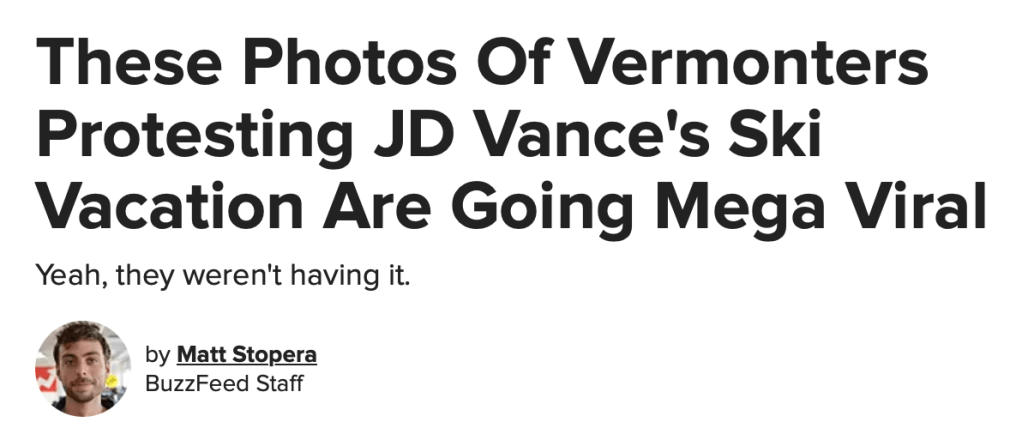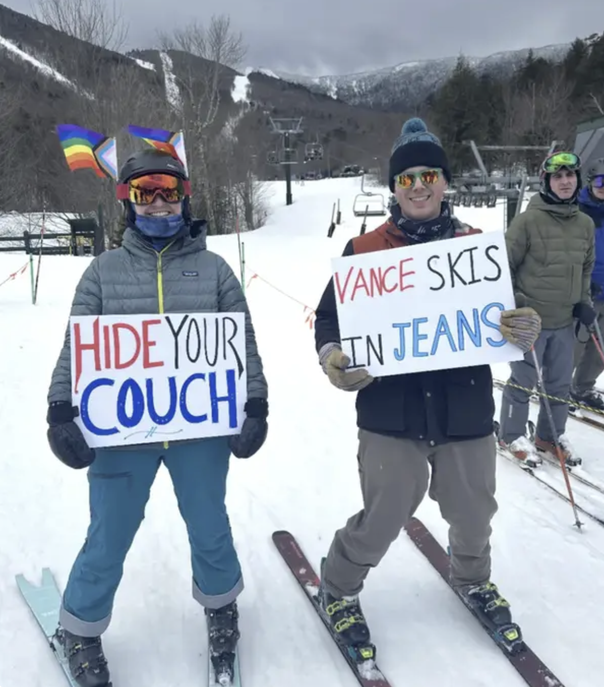 JD Vance’s Vermont vacation was a disaster thanks to outspoken backlash over his display of MAGA fascism. Those protesting made it abundantly clear that the Green Mountains are much bluer than they appear on social media. I must say, I was pleasantly surprised with the quality and quantity of outrage he encountered. Considering, for now, in terms of overall friendliness, Vermont is the closest thing America has to a Canadian state. Even going by the Cannuck “Sorry” scale measuring sweetness, Vermonters typically fall somewhere between “Sorry, it’s no Maple Syrup” and “Sorry, it’s no Hockey highlights.” Ironically, the entire Vermont trip began as a hairy misunderstanding for the Vance family. While his wife and kids always knew the plan was to ski, JD falsely assumed they would be tapping trees for Syrup. It wasn’t until Vance arrived at Sugar Bush that he realized it was the name of a ski resort, not the sticky byproduct of raw dogging a Maple tree to completion.