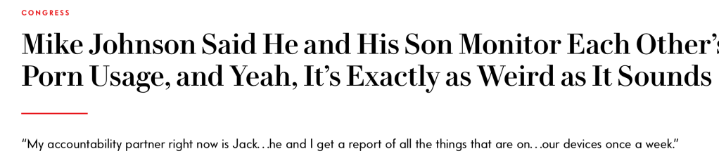 Speaking of closeted perverts of the GOP, Speaker Mike Johnson recently told his colleagues to refrain from holding town hall meetings altogether. His claim is that the people attending these civil discourse displays are either undercover Democrats or Republicans being paid by one. I haven’t laughed that hard at the Louisana Bible Boy’s nonsense since he openly admitted that he and his son monitor each other’s porn intake like a Johnson masturbatory oversight committee. I don’t know what type of Republican behavior I find more bizarre? Getting text notifications every time your father/son finishes a “Pegging How To” on Pornhub or JD Vance going bareback during sex because he’s less likely to encounter STDs and unwanted pregnancies than lint balls, bed bugs, and loose change.