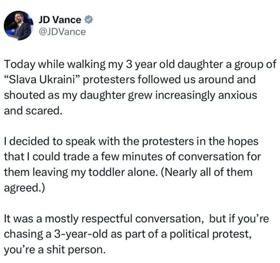 How can you blame We The People for rising up against this amateurish administration? I mean, Trump’s anti-LGBTQ+ military policies are so irrational even the plane that dropped the atomic bomb on Hiroshima is suddenly a stain on American values. No, not for slaughtering 200,000+ innocent lives, but because MAGA now considers it a DEI hire for being named the Enola Gay. Thankfully, the statute of limitations expired for the Enola Gay long ago. Otherwise, flying an A-bomb codenamed Little Boy over to Japan might be labeled child sex trafficking in this ass-backward political climate. Even Trump’s simpleton sidekick Vance is facing public backlash. But unlike Ice-Ventura-Immigration-Detective Kristi Noem, using a bulletproof vest for her protection in hostile territory. JD Vance uses his 3-year-old girl as a human shield. However, as always, Vance blew an entire Ohio situation way out of proportion after reimaging the truth. But unlike the Haitians of Springfield, Cincinnati lucked out that the Veep never accused their pro-Ukrainians of abducting and eating his pet toddler.