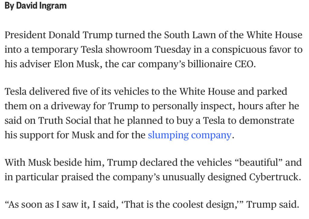 For More On The NBC News Article Quoted Click On The Link Below https://www.nbcnews.com/tech/elon-musk/trump-musk-tesla-white-house-showroom-buys-car-rcna195905