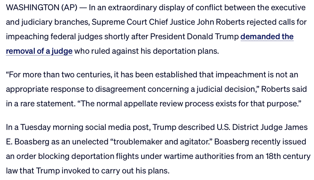 For More On The PBS News Article Quoted Click On The Link https://www.pbs.org/newshour/politics/chief-justice-roberts-rejects-trumps-call-for-impeaching-a-judge-who-ruled-against-him