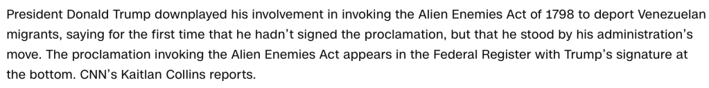 Trump has once again lied himself into a pretzel. Despite his Herbie Hancock being plastered all over the pertinent evidence, Trump claimed he never signed the unorthodox order giving him wartime authority to round up so-called “terrorists” or, as non-racists prefer to classify them, Latinos. Meanwhile, his entire administration gasped collectively as Trump’s fraudulent statement left his mouth. And not for the usual cringe-worthy reasons. But because without the President’s written consent, this entire operation goes from shaky legal grounding to a federally-sanctioned mass kidnapping. On the bright side, it was rather refreshing seeing Trump stand behind one of his “State of the Regime” promises made earlier this month. Unfortunately for little Marco Rubio, that was chucking his ass under the blame bus.