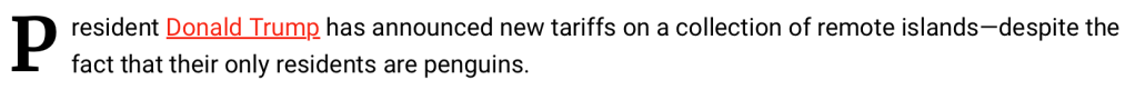 When asked why he refused to level tariffs on Russia and North Korea, Trump proclaimed, “I owe everything to my closest allies. If not for their election interference, these next four years would’ve been spent lying in the Big House, not lying from the White House!” Then, when asked to comment on his decision to penalize an island of Penguins named Heard and Mcdonald. He said, “Well, if a heard of birds can afford a private island with a McDonald’s and tuxedos, then surely they can afford to pay more in tariffs.” You know it’s only a matter of time before there’s a Heard-and-Mcdonald Island Trump Tower covered in Penguin shit.