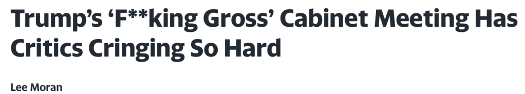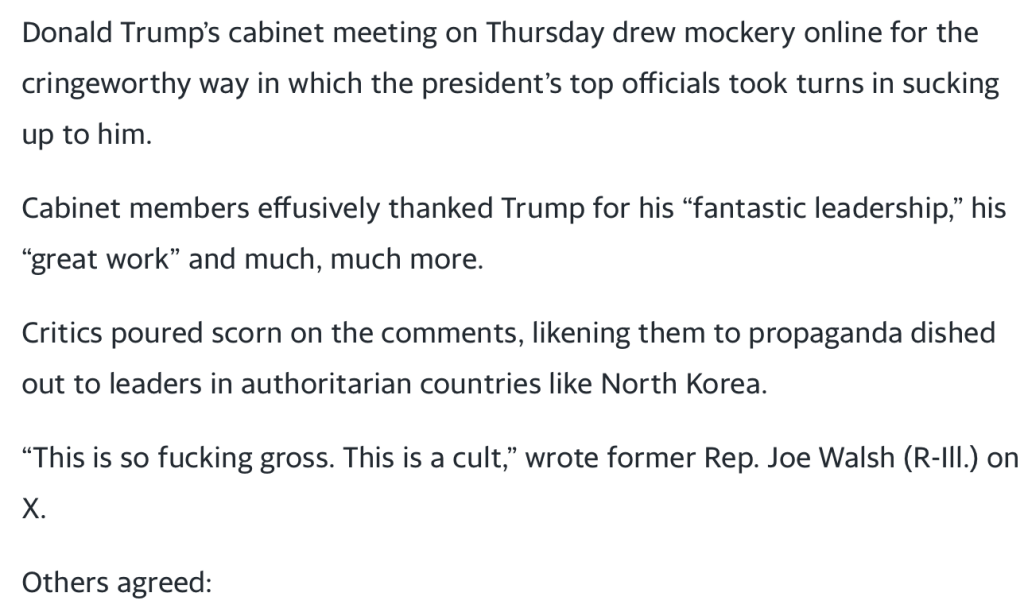 I realize people don’t often comprehend they are part of a cult until it’s far too late. So, much like the victims of the Jonestown Massacre, Trump’s Cabinet Members won’t realize the joke’s on them until they reach the punchline. You would think that after Trump single-handedly destroyed the world’s economy, the President’s closest advisors would have substituted the self-congratulatory circle jerk with an intervention. But, apparently, along with corruption, incompetence, and bigotry, blind loyalty is a prerequisite for joining this MAGA sect. It makes sense, considering that both cults and religions are built in the image of their scam artist founder; the only difference between the two is that in religion, the founder is already dead.