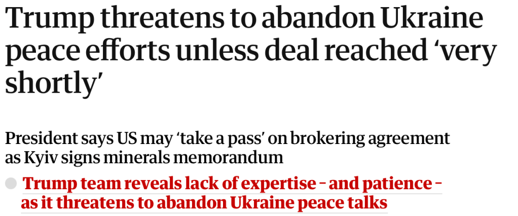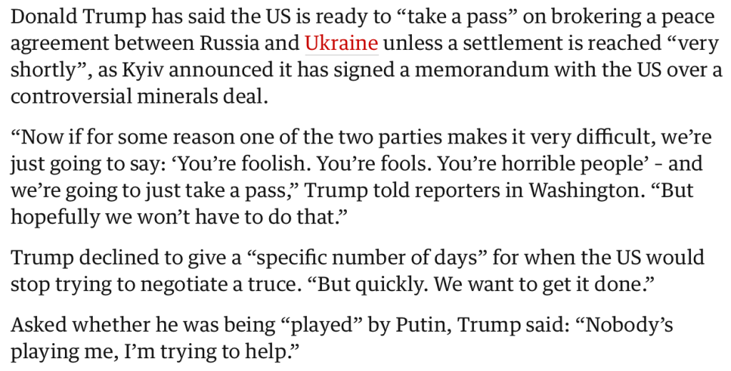 The Entire Guardian Article Quoted https://www.theguardian.com/world/2025/apr/18/us-ready-to-abandon-ukraine-peace-deal-if-there-is-no-progress-says-marco-rubio