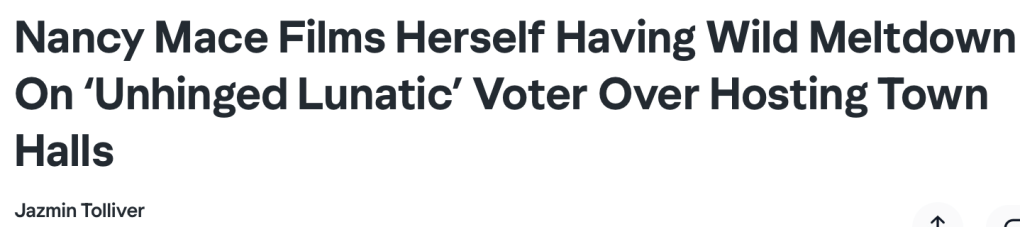 Nancy Mace was caught on camera during her latest hysterical outburst. And by “caught,” I mean she willfully posted a video any other Karen would pay ransom for just to keep it out of the public eye. If self-awareness was a superpower, then MAGA Mace is the Kryptonite. Even Helen Keller would recognize that was a bad look for the Congresswoman. Claiming her constituent was the “Unhinged Lunatic” after she irrationally overreacted to a reasonable question. Conceptually, it’s the equivalent of a 9/11 hijacker blaming the plane crash on the World Trade Center. Mace wears her exploitation of victimhood like a badge of honor and as a cover for her hypocritical victim-blaming bullshit. Taking Trump’s side against his rape victim E Jean Carroll is cruel and unusual punishment, especially if she suffered the same fate herself. You don’t hear any Holocaust survivors saying since those who died were at the wrong place at the wrong time, they had it coming.