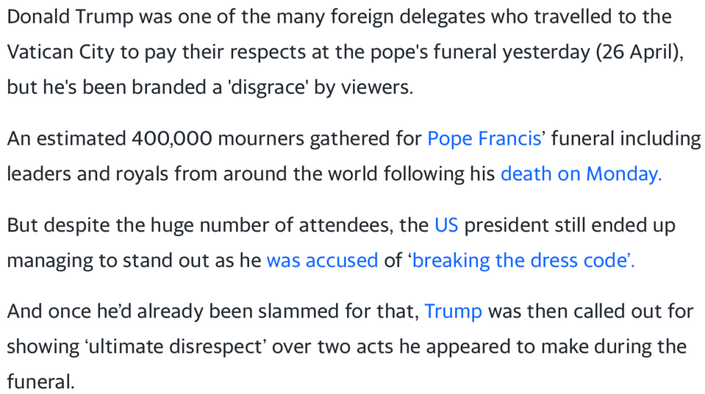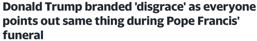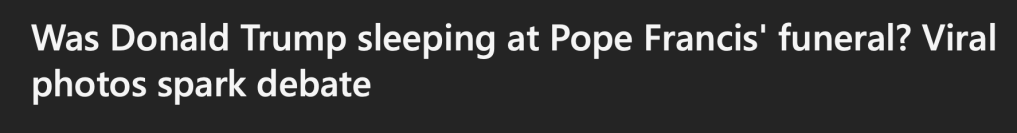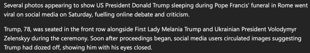 As if Trump attending the Pope’s funeral looking like a ginormous pile of Gargamel’s Smurf shit wasn’t disrespectful enough. He also chose the somber event to prove when it comes to public sleep farting, President Biden doesn’t hold a candle to Dozy Donny’s fat ass, and not just to prevent blasting a Dutch oven wildfire into the second row. Even Melanie was so mortified by her plus-sized plus-one’s behavior she openly prayed her no-good chubby hubby would meet the Pope’s identical fate, being bored to death by a JD Vance story.