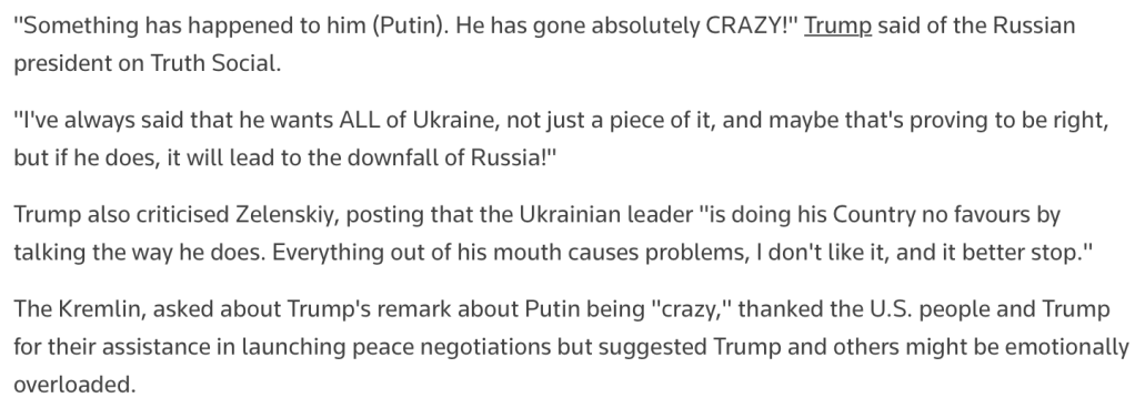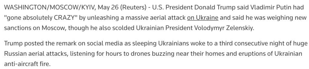 The Reuters Article Quoted – https://www.reuters.com/world/europe/trump-says-putin-has-gone-absolutely-crazy-considering-more-sanctions-russia-2025-05-26/