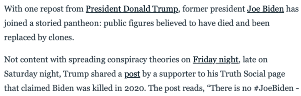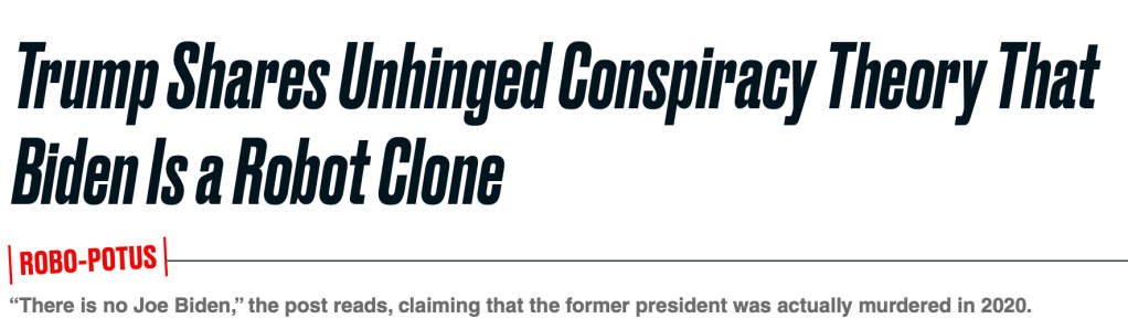 The Daily Beast Article Quoted – https://www.thedailybeast.com/donald-trump-shares-bonkers-conspiracy-theory-about-joe-biden-being-replaced-by-clones/
