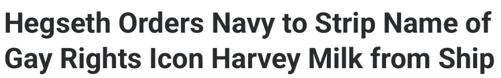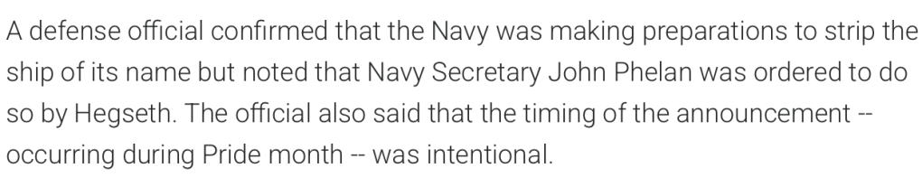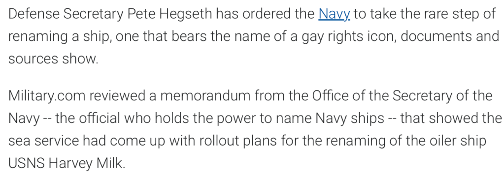 The Military.com Article Quoted – https://www.military.com/daily-news/2025/06/03/hegseth-orders-navy-strip-name-of-gay-rights-icon-harvey-milk-ship.html