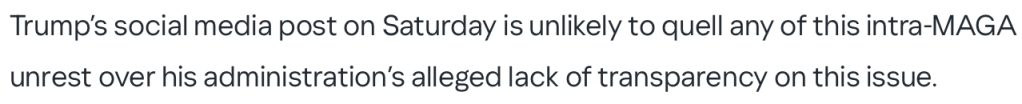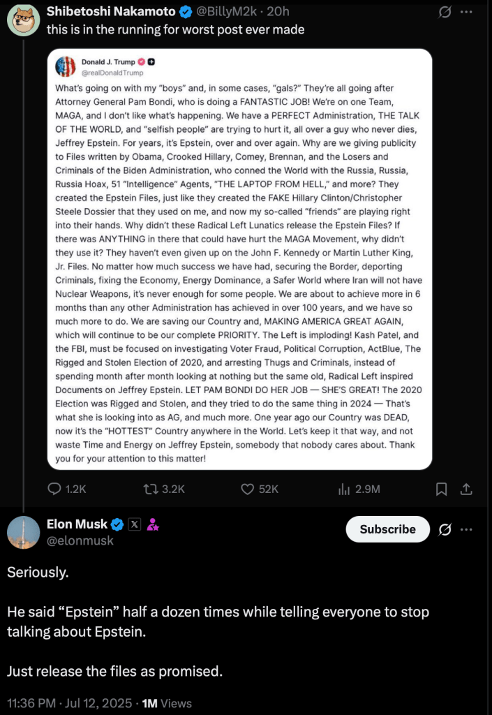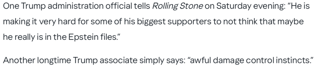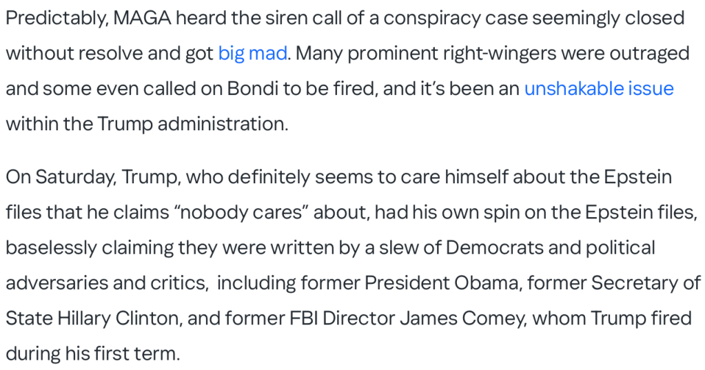 Sure, justice for Trump would be a prison sentence, but getting fucked in the end by a pedophile does make for a sweet karmic consolation prize. Since it is obvious, Trump underestimated the fly-to-shit attraction between morons and conspiracy theories. Not to mention, the Epstein files have always been the lube MAGA influencers used to jerk Trump’s base right into believing the Democrats were the party of perves and diddlers despite facts cockblocking that argument. So, without ever finishing off his base with a desired money-shot moment, the entire MAGA circle jerk is now left holding their dicks and somehow blaming Pam Blondi, not Trump, for their political loyalty suddenly turning bluer than their balls. Because, at the end of the day, no one cares about getting to the bottom of a sex trafficking ring more than a bunch of misogynists, whose devotion to a sex offender is what got us here in the first place.