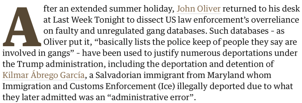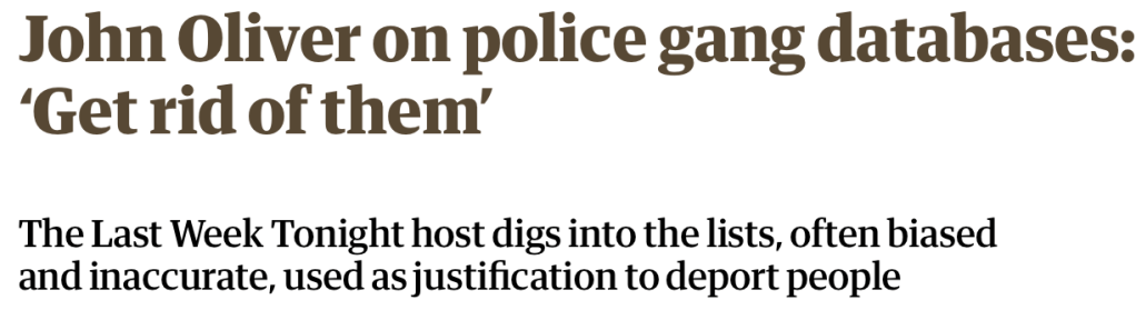 The Guardian Article Quoted – https://www.theguardian.com/tv-and-radio/2025/jul/28/john-oliver-police-gang-databases-recap