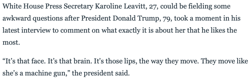 The Daily Beast Article Quoted – https://www.thedailybeast.com/donald-trump-goes-gaga-for-press-secretary-karoline-leavitt-its-those-lips/
