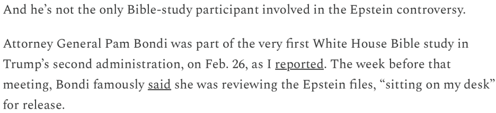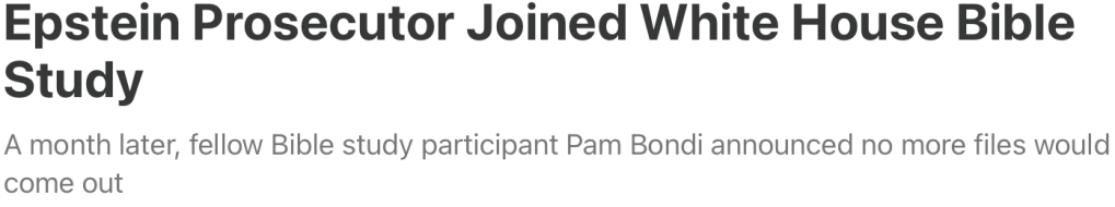 Just when the Epstein case had Christians thinking, “Finally, a pedophilia scandal, we can tweet about!” Pam Bondi and Alex Acosta did what any accomplice to a sex crime does: found “God” just in time for the cover-up. Converting the White House Bible Study Group into “The Sticky-Situation Room.” Ground zero for Trump’s Epstein File whitewashing operation and the least-embarrassing reason why the WH Mudd Chapel’s paper shredder-to-bible ratio is 47-0.