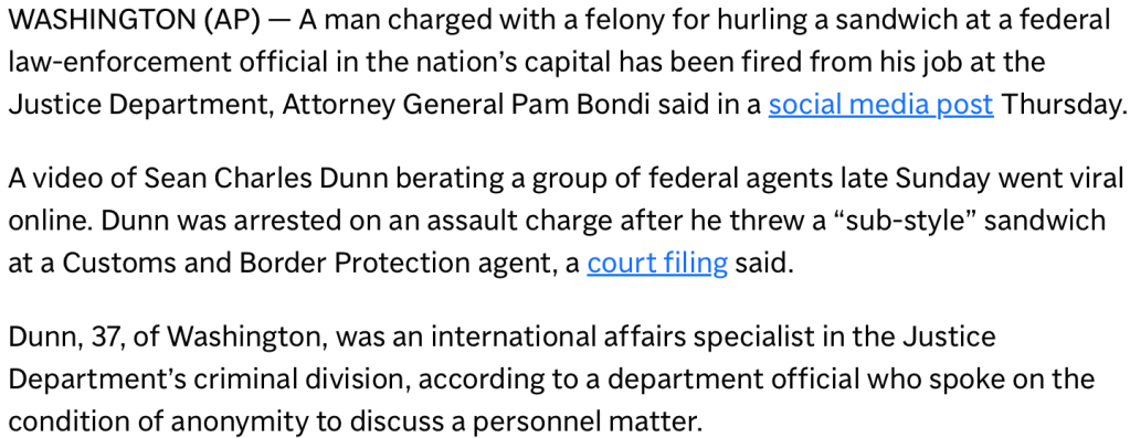 In Today’s Palate Cleanser, we learn that DC US Attorney Jeanine Pirro not only backs the blue but also employed the sandwich-wasting booze-bag who assaulted them. MAGA: defunding police, sponsoring their DC attackers, and pretending to be the party of Law and Order since Jan 6th, 2021.