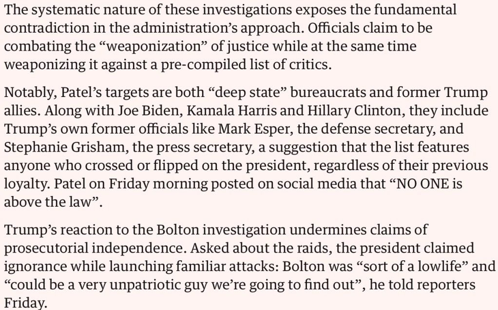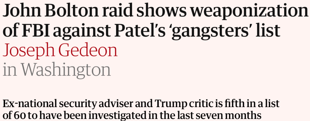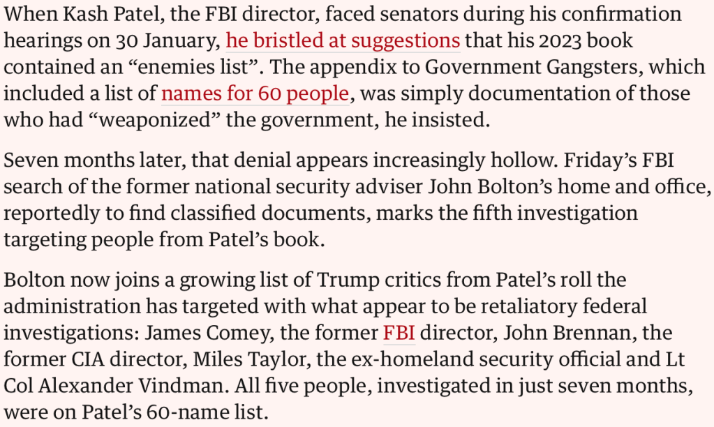 The Guardian Article Quoted – https://www.theguardian.com/us-news/2025/aug/22/john-bolton-kash-patel-book-list