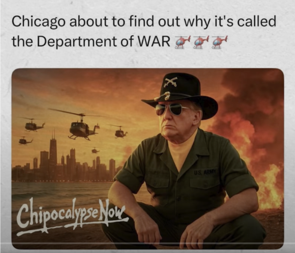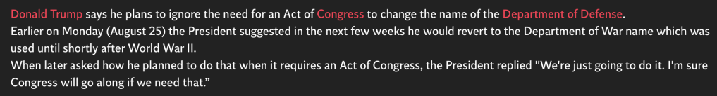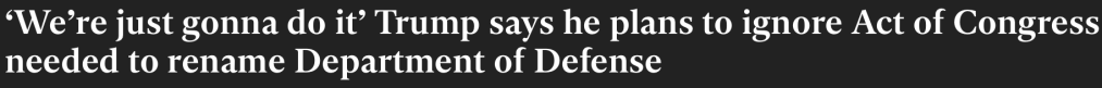 In today’s Palate Cleanser… Since only Congress can legally change the name of the DOD. Donald Trump is now officially Commander-in-Chief of the Department of Defense-Department of War. Because nothing screams “Bromoerotic” like a hyphenated last name.