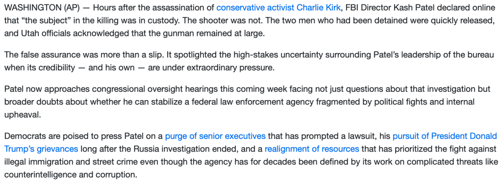 The Atlanta News First Article Quoted –https://www.atlantanewsfirst.com/2025/09/13/patel-faces-congressional-hearings-after-missteps-charlie-kirk-assassination-probe/