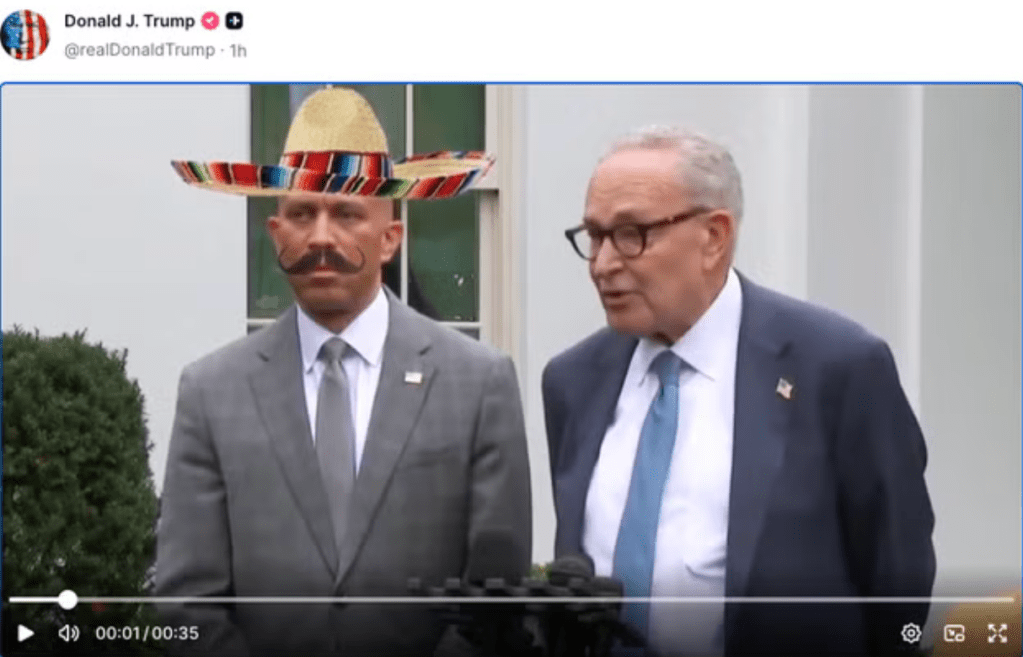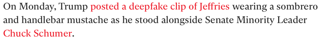 In today’s Palate Cleanser, we learn that Vincent Van GoBackToYourCountry, Donald Trump has learned how to incorporate AI into his racism, outfitting Hakeem Jeffries in a fake sombrero and mustache because even the hate speech policy at Truth Social found the doorag and watermelon version far too offensive. And here I thought the pinnacle of creativity was Trump sketching underage birthday nudes for pedophiles.