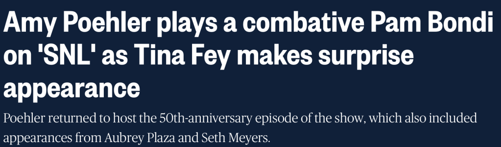 In today’s Palate Cleanser, we learn that Amy Poehler hosted SNL last night. And did such a spot-on impersonation of Pam Bondi that Donald Trump attempted to fire her over text, but got confused and posted it in the Bang Bros comment section.