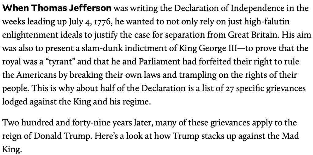 You would assume Donald Trump would have a lot more in common with a bunch of land-owning white guys who didn’t want to pay taxes and thought minorities shouldn’t vote. Yet, if you’ve read the American Founding Fathers’ Declaration of Independence, it sounds more like Jefferson’s 1-star Yelp review of Trump’s presidency. Trump has so much King George III in him that he would’ve already called the Ghostbusters, but even gay conversion exorcisms are a scam. Sure, the Declaration of Independence may be a nearly 250-year-old document bitching about some decaying tyrant, but so are the Trump passages in President Biden’s diary.