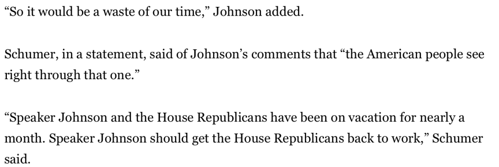 In today’s Palate Cleanser, Speaker Mike Johnson, a middle-aged man trapped in the body of an 11-year-old altar boy, questioning his sexuality, has already given himself nearly 5 months’ vacation to catch up on current events. And yet, he still doesn’t have a clue what the fuck anyone’s talking about, if it’s not related to Jesus or which PornHub video his son is masturbating to. “Jeffrey Epstein?…. Never heard of him…. Is he the new Democratic Congressperson I refuse to swear in, for absolutely no reason at all?”