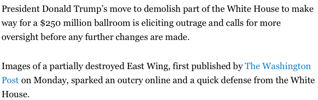 The Politico Article Quoted – https://www.politico.com/news/2025/10/22/white-house-demolition-sends-shock-waves-spurs-calls-for-pause-00618230
