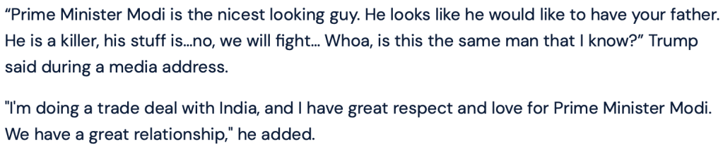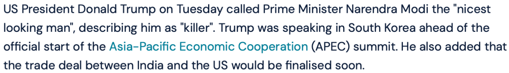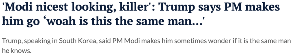 The Hindustan Times Article Quoted – https://www.hindustantimes.com/india-news/modi-nicest-looking-killer-trump-says-pm-makes-him-go-woah-is-this-the-same-man-101761715249041.html#google_vignette