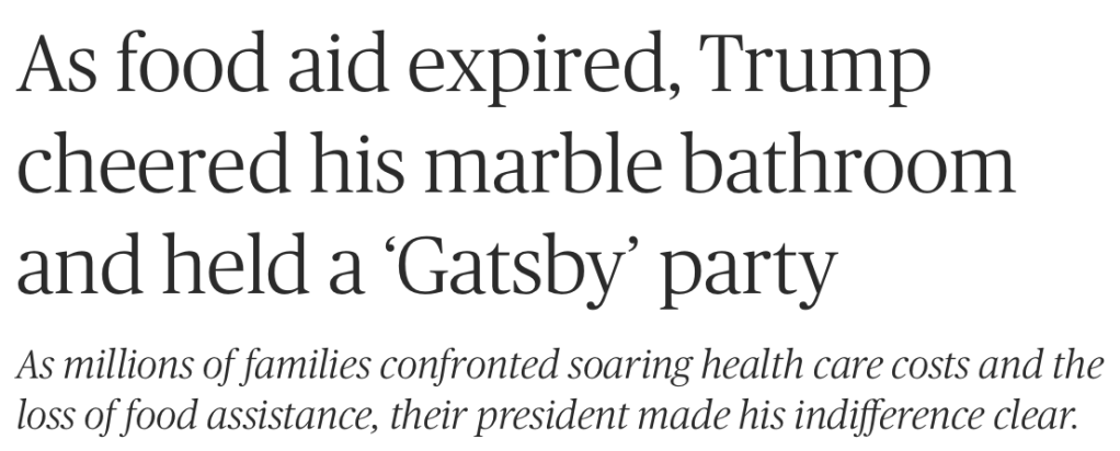Donald Trump threw himself a “Great Gatsby” themed party the night before SNAP benefits would dry up for 42 million food-insecure Americans, titled: “A Little Party Never Killed Nobody.” A name that not only ignores the potential starvation of millions but also contradicts F. Scott Fitzgerald’s point entirely. Which is ironic, because empathy is usually a 79-year-old-felon-who-can’t-read’s only superpower. Sure, illiteracy may be one of the many reasons why Trump routinely ignores the Constitution, but it’s the only reason taking a dump requires a window seat.