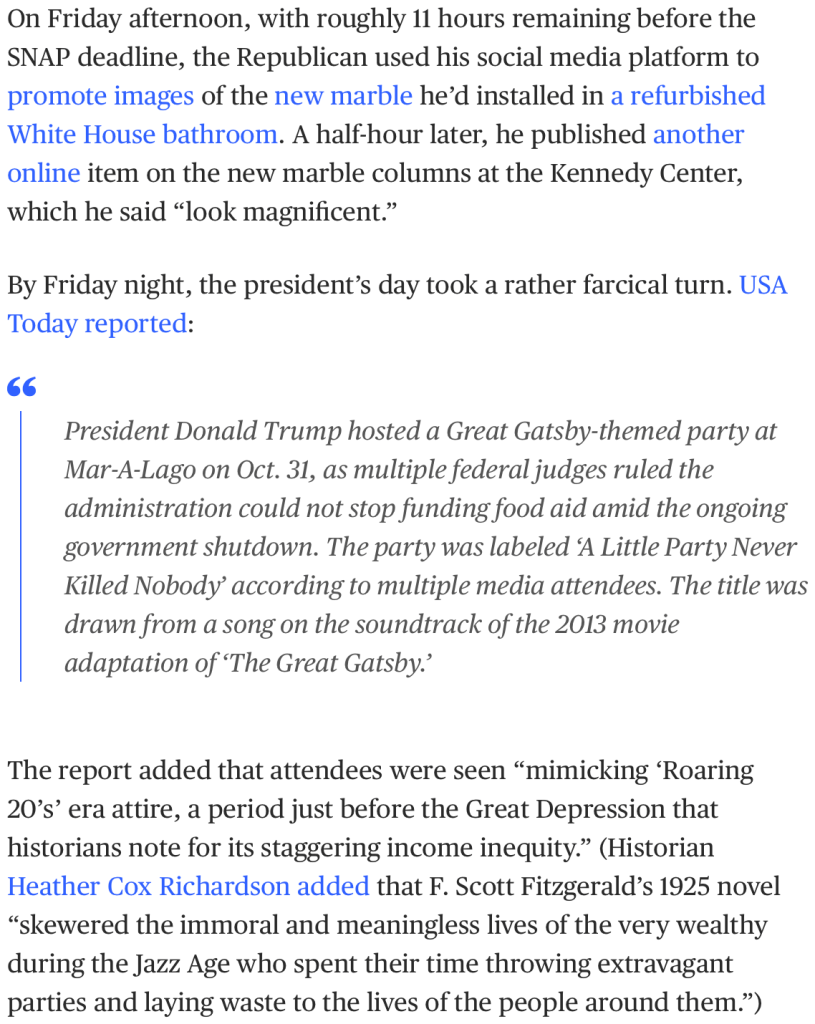 The MSNBC Article Quoted – https://www.msnbc.com/rachel-maddow-show/maddowblog/food-aid-expired-trump-cheered-marble-bathroom-held-gatsby-party-rcna241552