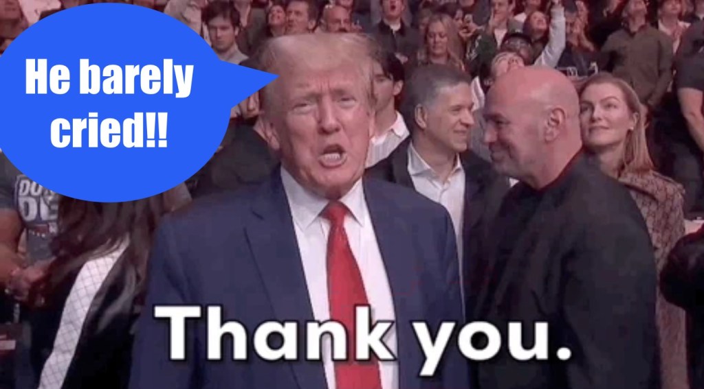 Donald Trump claimed the only reason he initially refused to release SNAP benefits was that it would violate the law. Sure, most people would gladly break the rules to feed starving children, but not Trump. He’d never knowingly commit a crime unless it was an extreme circumstance like: wanting to win an election he already lost, or suffering blue balls every time a New York 7 cries “NO!” It’s no wonder Donald Trump admires the UFC, considering no one promotes fights between the poor and the hungry better than President Dana White-Supremacist.
