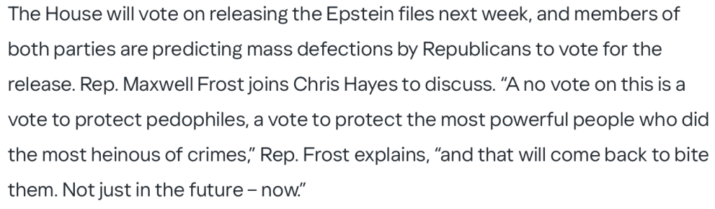 Now that the discharge petition has reached the necessary 218 votes to release the Epstein files, the GOP suddenly realizes they can no longer protect Donald Trump. Sure, their first instinct was to jump into bed with a sex offender, but even Republicans prefer covering their own ass to getting fucked by a pedophile. Which is ironic because the one person Trump hates more than a backstabber is a cocktease. MAGA: the only place where having zero shame in your game is considered a superpower, and the definition of sloppy seconds is Midelfart.