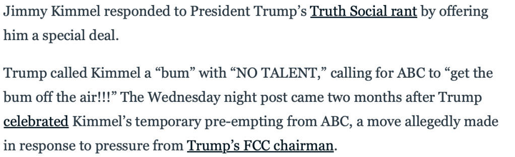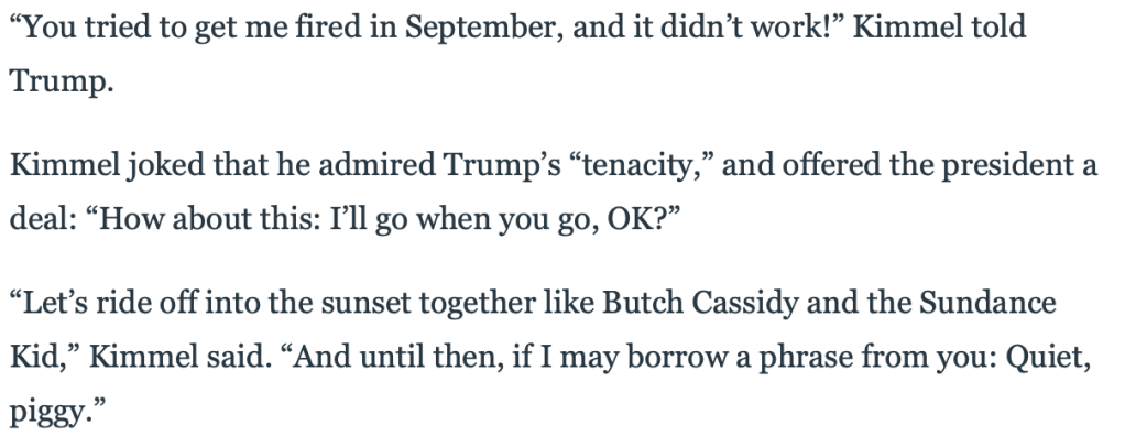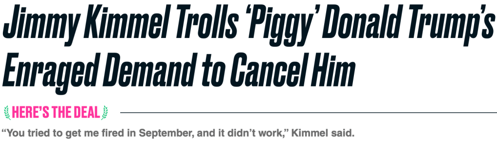 The Daily Beast Article Quoted – https://www.thedailybeast.com/obsessed/jimmy-kimmel-trolls-piggy-donald-trumps-enraged-demand-to-cancel-him/