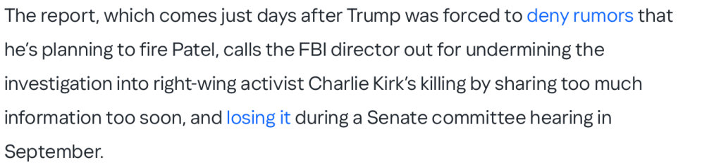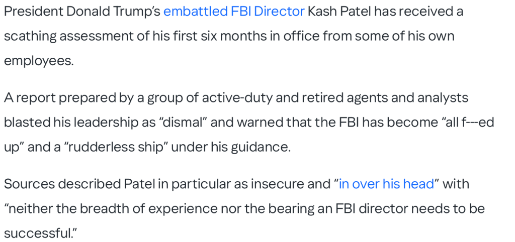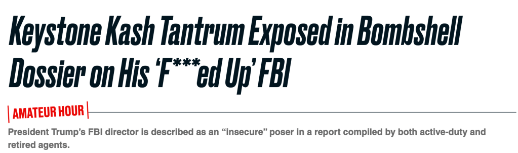 A recent report prepared by active and retired FBI agents characterized Kash Patel as an insecure little bitch whose overall vibe is: kids’ table tantrum. If only the thin blue line between saving the day and shitting the bed was an emotional support windbreaker in a women’s smedium. However, Keystone Kash isn’t the FBI Director MAGA needs; he’s the fat guy in a little coat it deserves.