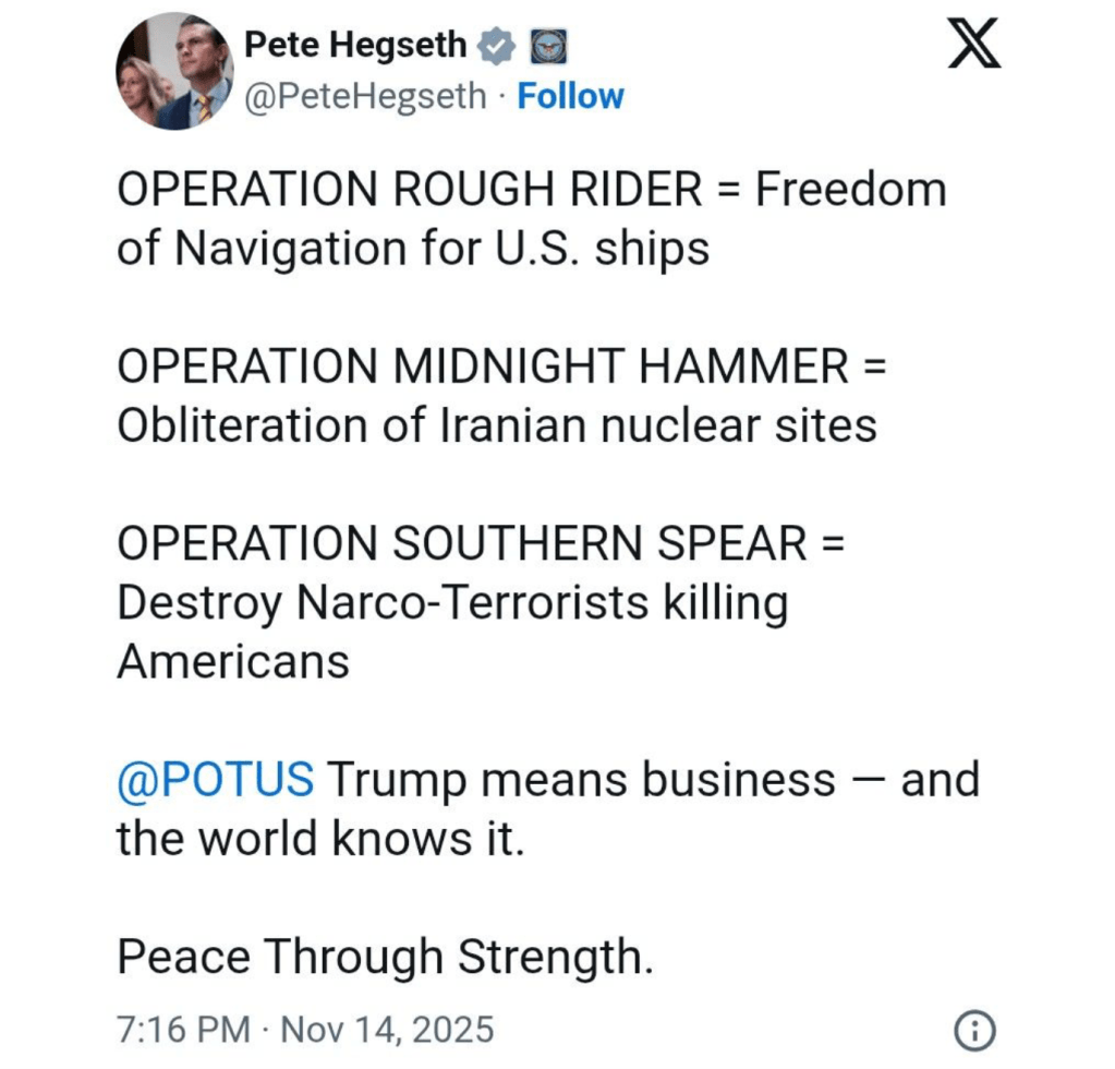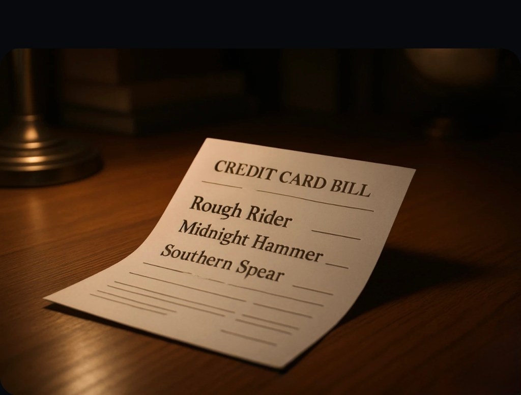 In Today’s Palate Cleanser, we learn that the only thing worse than Secretary of War Crimes, Pete Hegseth, calling it operation “Kill Everything,” is finding out Operations Rough Rider, Midnight Hammer, and Southern Spear were all named after Hegseth couldn’t find a better explanation for the hotel-room purchases made on his wife’s credit card.
