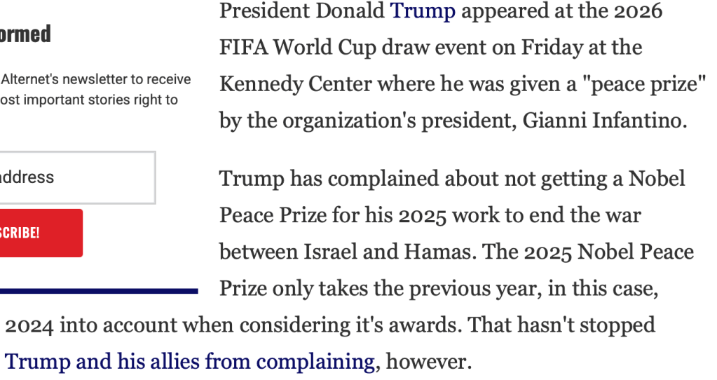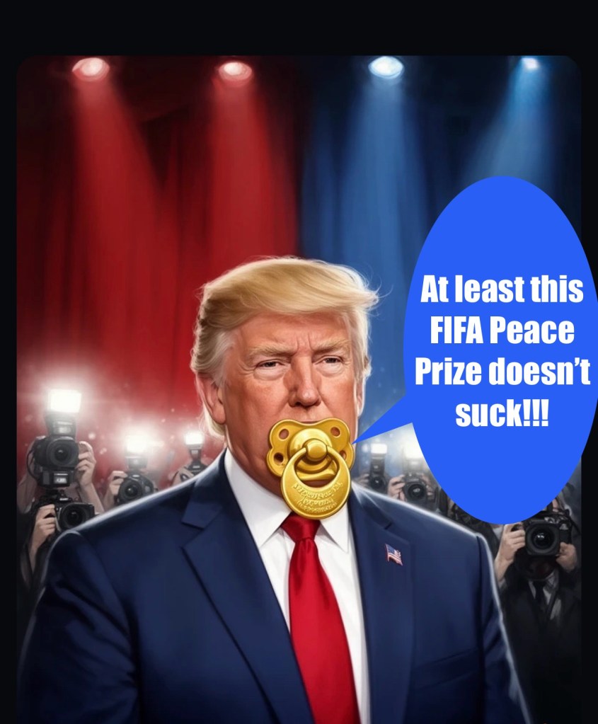 Donald Trump recently received FIFA’s first-ever Peace Prize. An award ceremony with all the pomp and circumstance of the Oscars and the prestige of finding a Female Body Inspector (FBI) T-shirt in the Hooters’ dumpster. Because the only international sports organization award Trump is earning on merit is a participation medal from the Special Olympics. Never mind that the only peace prize he deserved was the steaming piece, Melania left marinating upper deck in the Lincoln bathroom. What’s next, RFK Jr receives the American Medical Association Distinguished Service Award from the Measles, Mumps, and Rubella?