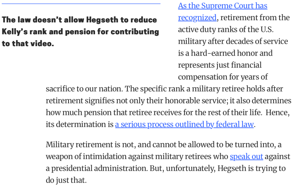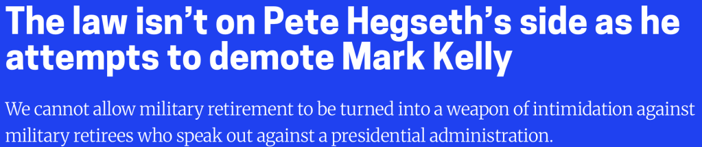 In today’s Palate Cleanser, we learn that Pete Hegseth, the person you would draw if your Pictionary card read: Racist Gigilo. Plans to fine and demote Sen Mark Kelly, a decorated Vet, wartime fighter pilot, astronaut, inspiration for the Avengers, and the man whom Tom Cruise often thinks about when he masturbates. All because he once quoted the letter of the law in a video that Trump took as personally as a diss track written by Biden’s Autopen. Meanwhile, Pete Hegseth’s greatest contribution to the American Military was not accidentally cc’ing Maduro’s bodyguards on the “Venezuela’s Super Fucked” Signal Chat.