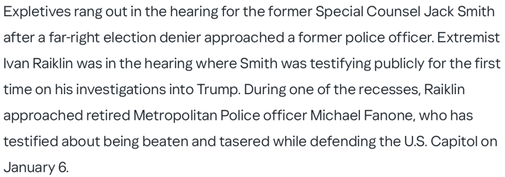 In Today’s Palate Cleanser, we visit Special Prosecutor Jack Smith’s Congressional hearing. Where, according to Republicans, up is down, right is wrong, and the Capitol Police, who were nearly beaten to death on January 6th, clearly wanted it. I mean, if they didn’t want to cause a riot, why did they dress in such revealing riot gear? Seriously, if you listen to Jim “Make Coaching Sandusky Again” Jordan, you would think the only reason Officer Fanone carried a nightstick was so an Insurrectionist could give shoving-it-up-his-ass the old college try. And in case you’re wondering who the man threatening to rape Michael Fanone’s kids on Trump’s behalf is. He’s Ivan Raiklin, the White Supremacist whom General Flynn calls “Jackpot” during glory-hole roulette.