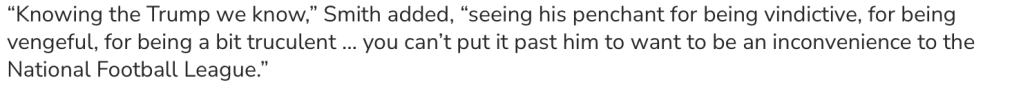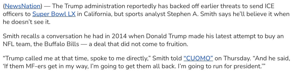 In Today’s Palate Cleanser, The Daily Show examines Trump’s obsession with the NFL. Apparently, Trump feels the best way to reintroduce violence into the Super Bowl is to blitz the zone with ICE Agents. I mean, it’s a Championship game in San Fransico featuring New England vs Seattle with a halftime performance from Bad Bunny. Not quite the home-field advantage Trump enjoyed at the Capitol during his Insurrection. So, for Trump, no matter who wins, it’s the equivalent of watching Democrats storm the bitches of Mar-A-Lago on “Whip Em Out” Wednesday. The only way Super Bowl Monday’s sorest loser isn’t Donald Trump is if Kristi Noem turns the Puppy Bowl into target practice.