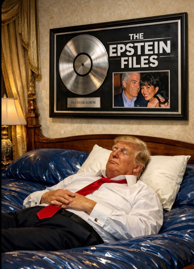Last summer, when I wrote, “Trump prays he’s in the Epstein files less than Jesus is in the Bible.” I presumed I was crafting a joke, not foreshadowing a brainless fear-monger’s path like the Wizard of Oz Pearlman. However, since then, the name Donald Trump has appeared in the unredacted Epstein Files over a million times. Which is far more shout-outs than Jesus, Mary, her Little Lamb, or any of the other 727,993 words ever earned in the ‘Homophobe’s Guide To The Galaxy,’ King James Edition. And yet, why do I have this sneaking suspicion that Trump plans to recognize this “achievement” by issuing himself a faux platinum album to hang above his Melania-less waterbed.